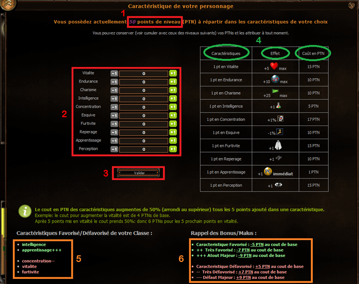 Le coût en PTN dune caractéristique augmente de 50% (arrondi au supérieur) tous les 5 niveaux débloqués dans celle-ci. Vous remarquerez si vous placez tous vos points dans la même caractéristique, que celle-ci verra son coût en PTN augmenter rapidement.