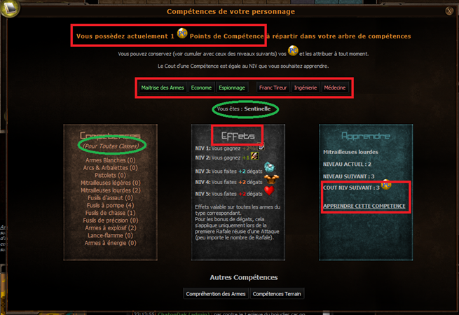 Il existe 6 groupes de compétences de classe. Parmi celles-ci, 2 sont accessibles à tous les joueurs (quelle que soit la classe de leur personnage) [Maîtrise des armes, Econome] ; les 4 autres sont spécifiques à la classe du personnage [Espionnage, Franc Tireur, Ingénierie, Médecine]. Augmenter ces compétences vous procurera des bonus non négligeables. Mais avant de voir ceux-ci plus en détails, intéressons-nous à la manière de faire évoluer ces compétences.